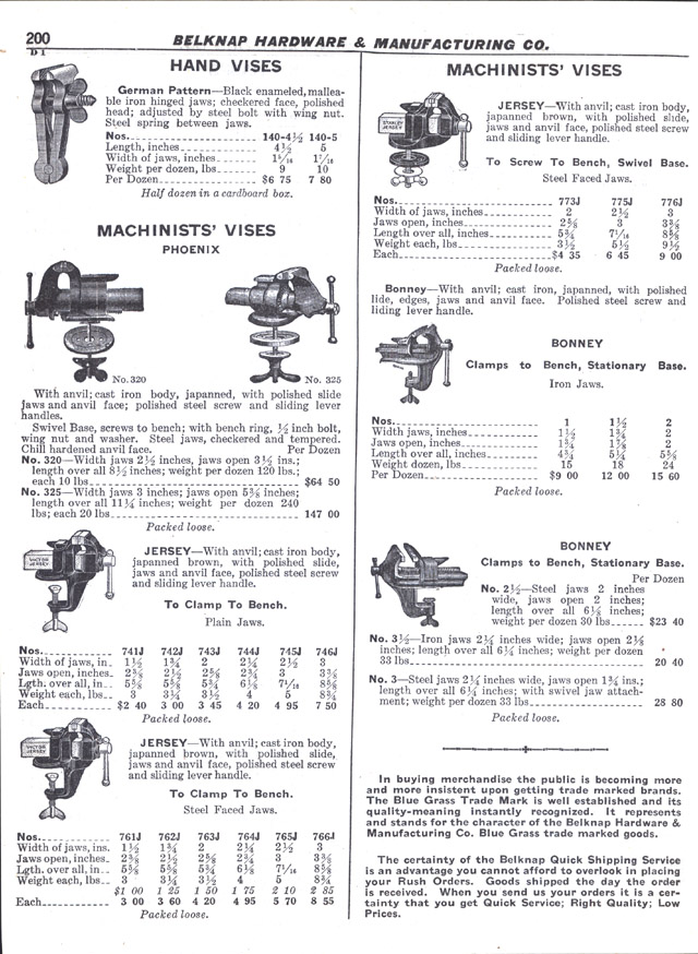 Page 200, Hand Vises, Phonix, Jersey and Bonney Bench Vises.