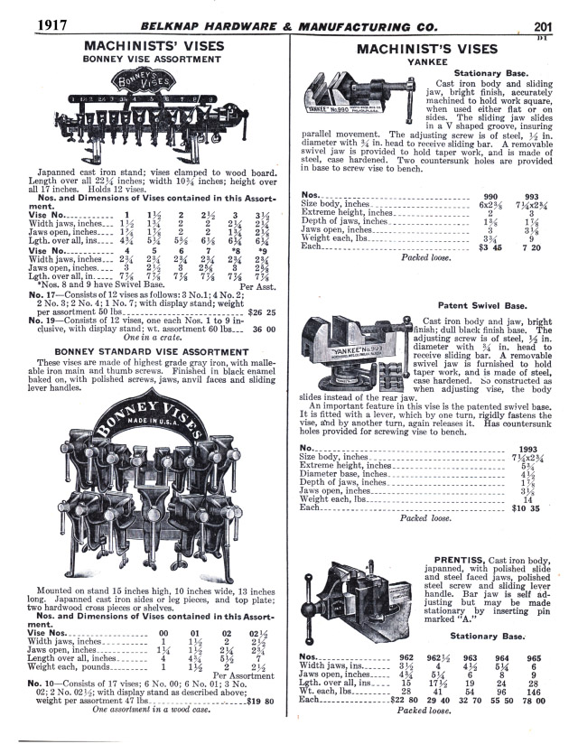 Page 201, Bonney Machinists’ Vise Display, Prentiss Patent Swivel Jaw Vises.