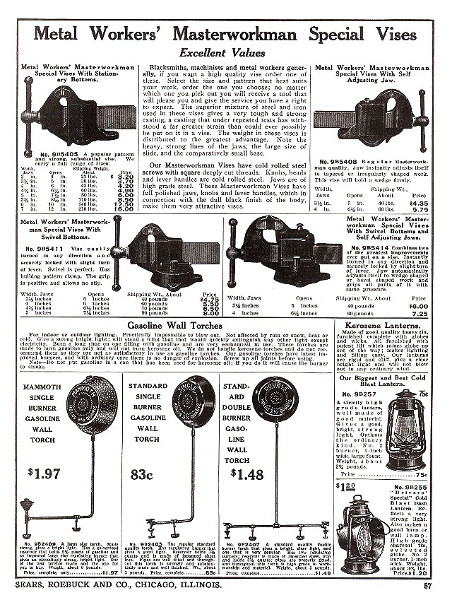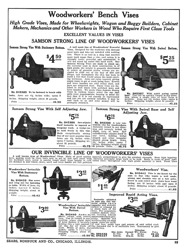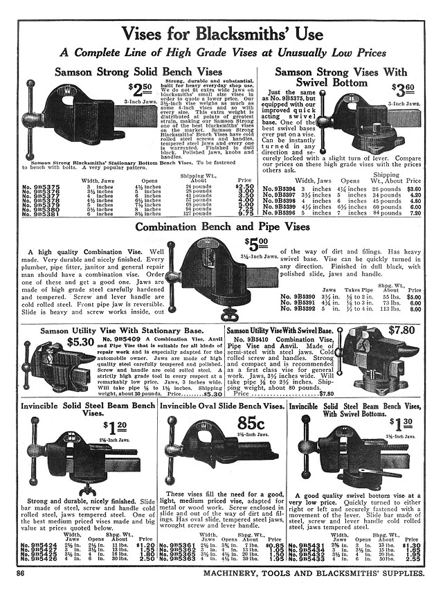 The lack of any branding on this ad indicates just how standardized leg vises had become. At this time more of these vises were sold without reference to the manufacturer than with. The English style blacksmiths vise, their scaling and being sold by weight had become a standard. The vise shown could be a Columbian or Iron City. However, the supplied vices could be from any American OR British manufacturer.