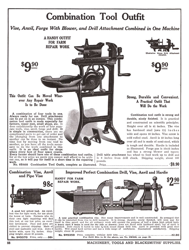 In this 1915 catalog there are more lathes advertised than forges even though it is a blacksmiths’ tools catalog. This was a sign of the times, blacksmiths were expected to repair steam engines and the ever increasing number of automobiles. But another reason for the offer of so many lathes was the growth of industry had made them affordable and they had developed to a standard that would remain nearly the same for over a hundred years and probably another.